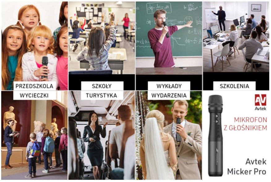 Micker Pro to urządzenie posiadające wbudowany wzmacniacz oraz 2 głośniki o mocy 10W. Zasilany jest za pomocą wbudowanego akumulatora i działa aż do 6 godzin!