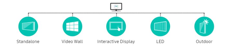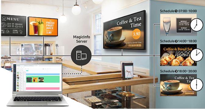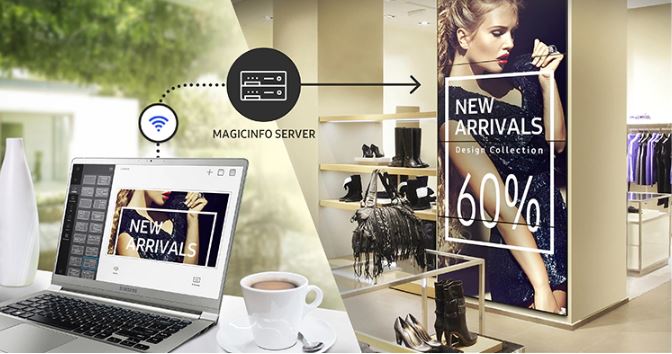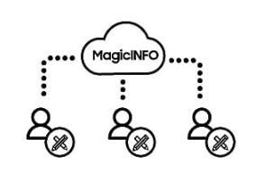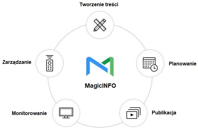 Rozwiązanie MagicINFO to kompleksowa platforma oferująca proste zdalne zarządzanie zarówno sprzętem, jak i oprogramowaniem i umożliwiająca zespołom odpowiedzialnym za treści aktualizację projektowanych komunikatów i harmonogramu ich wyświetlania z dowolnego miejsca i w dowolnym czasie. Platforma jest ponadto kompatybilna z różnorodnymi typami komercyjnych wyświetlaczy Samsung.