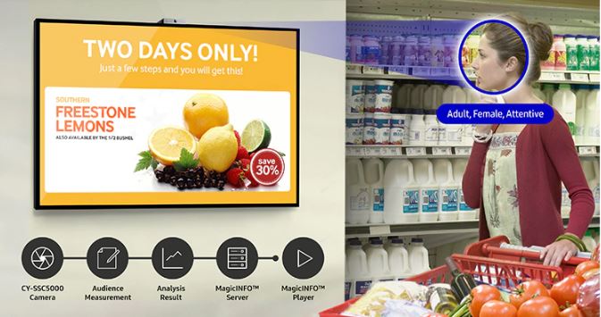 Połączona kamera 3D dzięki funkcji Audience Measurement rejestruje i analizuje ruchy i czynności klientów, a następnie we współpracy z dołączoną do zestawu aplikacją Content Manager oraz moderatorem MagicINFO I Player umieszcza odpowiednie treści w najlepiej widocznych strefach.