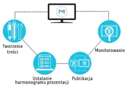 Efektywne i proste zarządzanie procesem od tworzenia treści przez jej prezentację aż po monitorowanie działania urządzeń.