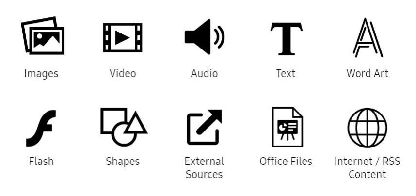 MagicINFO Author oferuje bibliotekę szablonów, ikon i obrazów pozwalających dostosować komunikaty do konkretnej grupy odbiorców.